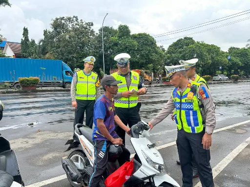Selain upaya perbaikan infrastruktur jalan, personel Satgas Gakkum Ops Keselamatan Jaya 2026 juga melakukan penindakan berupa teguran kepada pengendara sepeda motor yang tidak menggunakan helm saat berkendara.