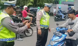 Selain upaya perbaikan infrastruktur jalan, personel Satgas Gakkum Ops Keselamatan Jaya 2026 juga melakukan penindakan berupa teguran kepada pengendara sepeda motor yang tidak menggunakan helm saat berkendara.