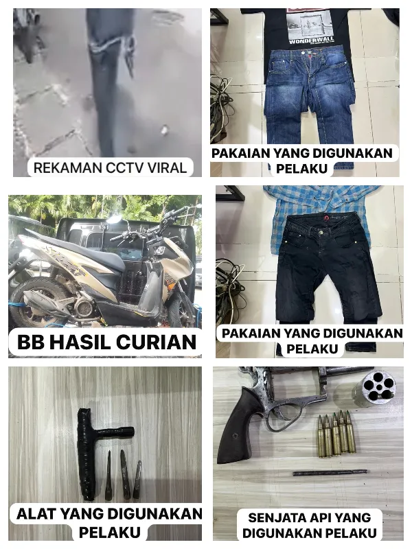 Dalam penangkapan tersebut, polisi mengamankan sejumlah barang bukti, yakni satu unit sepeda motor Honda Beat Street, dua unit handphone milik pelaku, tiga buah mata kunci letter T, satu buah gagang letter T, satu pucuk senjata api rakitan dan 5 butir peluru, rekaman CCTV, serta pakaian yang digunakan pelaku saat beraksi.